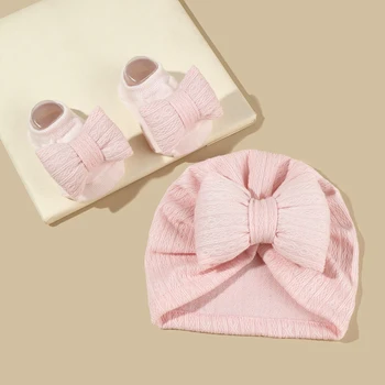 2Pcs Newborn Baby Bow Hat Socks Set Solid Color Cotton Infant Girls Turban Cap Anti-slip Socks Age: 2-12M Head size: 35-45cm Color:pink, white, cream, khaki, brown, old pink
