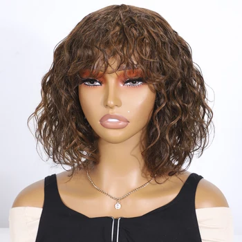 Short Human Hair Wigs For Women P4/30 Highlight Pixie Cut Wigs With Bangs Water Wave Remy Brazilian Hair Wigs Curly Wigs